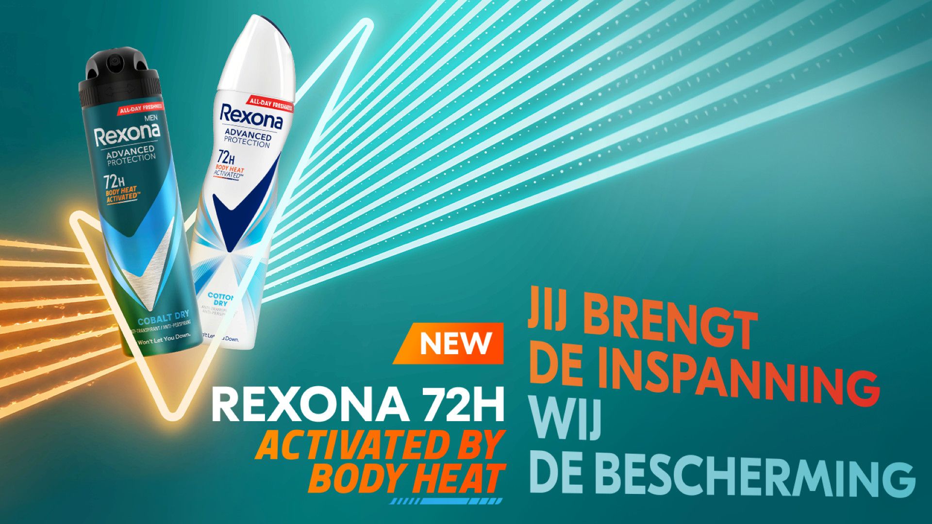 Dankzij de unieke technologie van Rexona zorgt de antitranspirant voor urenlange frisheid. Door deze technologie blijven microcapsules achter op je huidoppervlak. Die microcapsules worden vervolgens geactiveerd door beweging. Wrijving maakt dat de capsules openbarsten, waardoor een explosie van een frisse geur vrijkomt. Zo blijf je de hele dag lekker fris ruiken, ook als je volop in beweging bent. Zweet vlekken en lichaamsgeur houden jou daarom niet tegen. Blijf fris en droog zonder over je kleding te piekeren. Rexona blijft je beschermen, het maakt niet uit hoeveel je beweegt. Zelfs als je een berg beklimt, achter de bus aan rent, een presentatie geeft aan je baas of op een eerste date gaat, kun je vertrouwen op de beste zweetbescherming van Rexona. Rexona, it won't let you down.